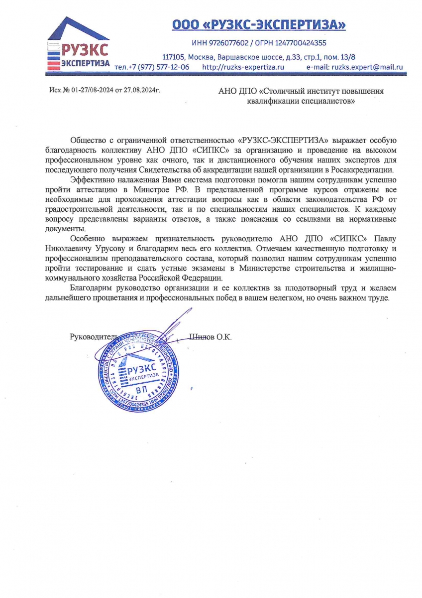 Общество с ограниченной ответственностью «РУЗКС-ЭКСПЕРТИЗА» выражает особую благодарность коллективу АНО ДПО «СИПКС» за организацию и проведение на высоком профессиональном…