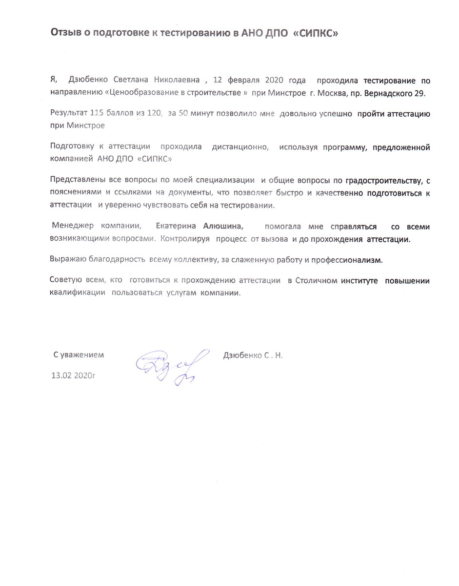Отзыв о подготовке к тестированию в АНО ДПО «СИПКС» Я, Дзюбенко Светлана Николаевна‚ 12 февраля 2020 года проходила тестирование по направлению «Ценообразование в…