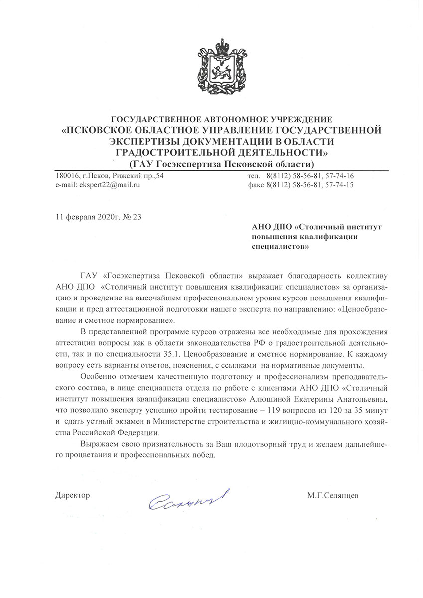 ГАУ «Госэкспертиза Псковской области» выражает благодарность коллективу АНО ДПО «Столичный институт повышения квалификации специалистов» за организацию и проведение на…