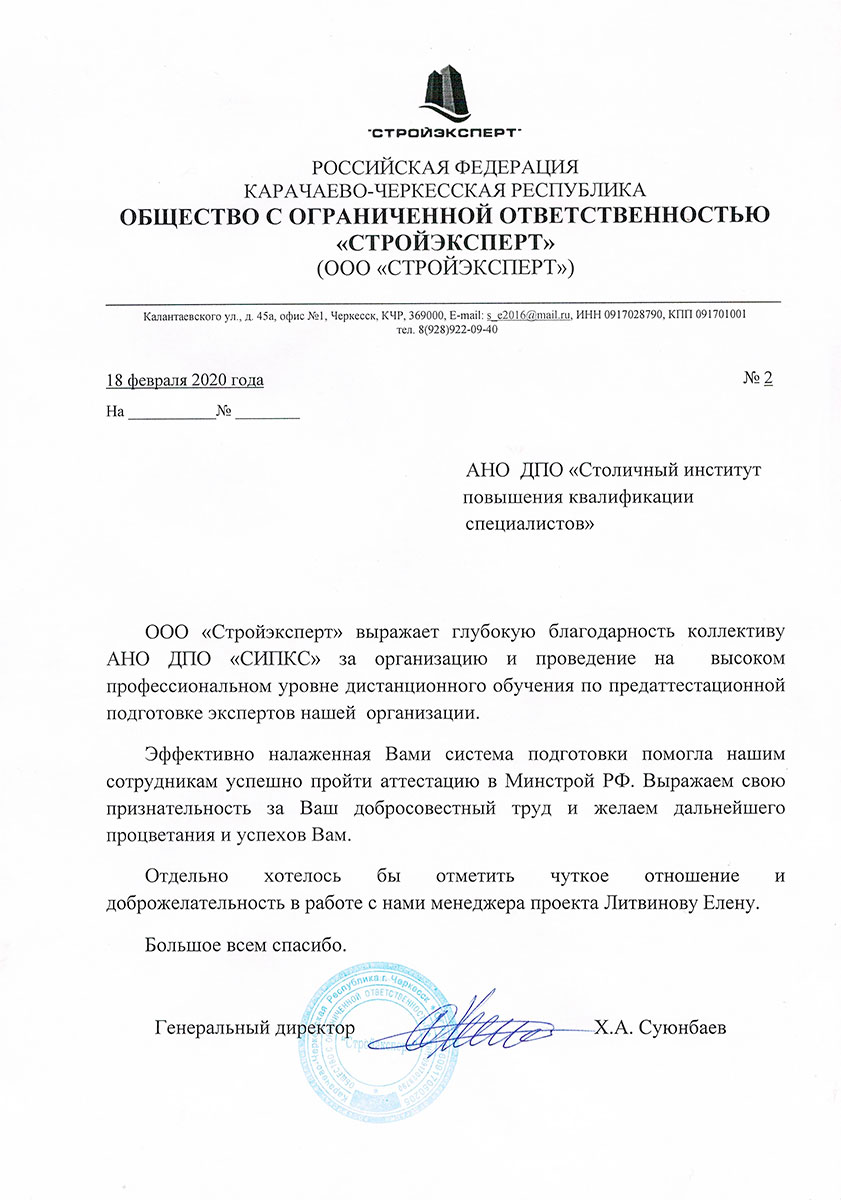 ООО «Стройэксперт» выражает глубокую благодарность коллективу АНО ДПО «СИПКС» за организацию и проведение на высоком профессиональном уровне дистанционного обучения по…