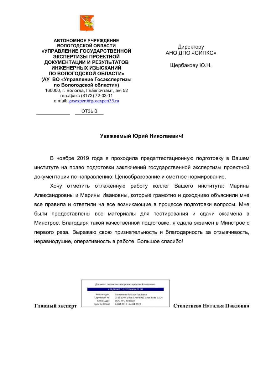 Уважаемый Юрий Николаевич! В ноябре 2019 года я проходила предаттестационную подготовку в Вашем институте на право подготовки заключений государственной экспертизы проектной документации по…